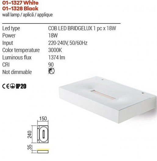 Vnitřní nástěné LED svítidlo vybaveno COB diodami o celkovém výkonu 18W, které vytváří nepřímé osvětlení. Konstrukce je vyrobena z kovu, lakovaná do matné bílé barvy. Svítidlo má průhledný akrylový difuzor. Hodnota CRI je 90. Svítidlo není možné stmívat.