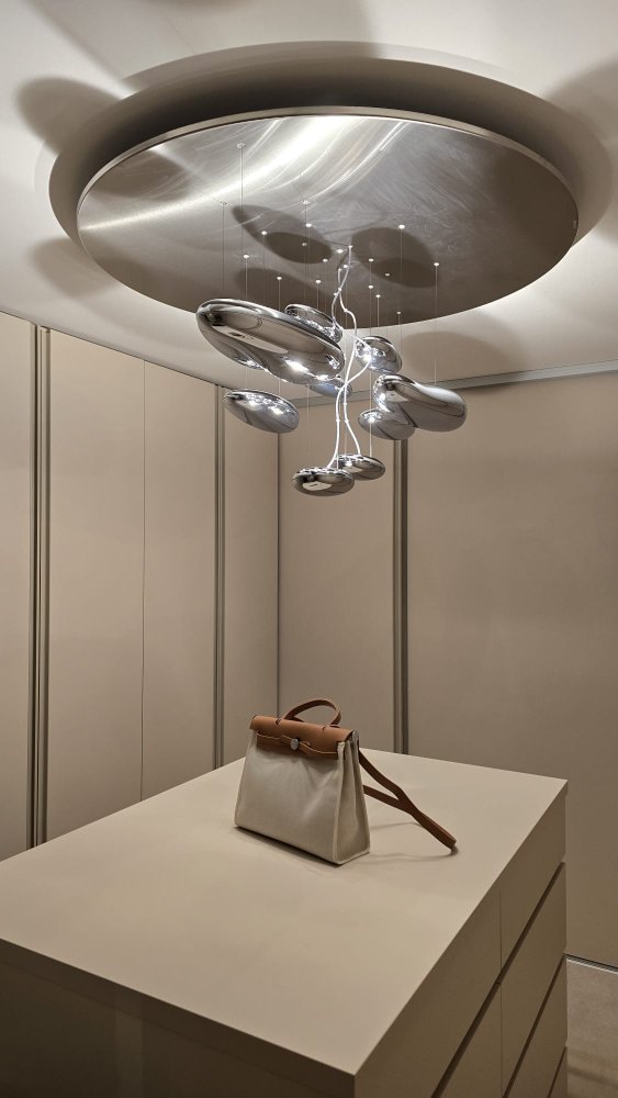 Jeho charakteristické „kapky“ s lesklým povrchem krásně odráží světlo i okolní interiér, takže šatna nepůsobí jen funkčně, ale i luxusně a elegantně. Díky nepřímému osvětlení vzniká příjemná atmosféra bez ostrých stínů, což je ideální právě pro každodenní používání.